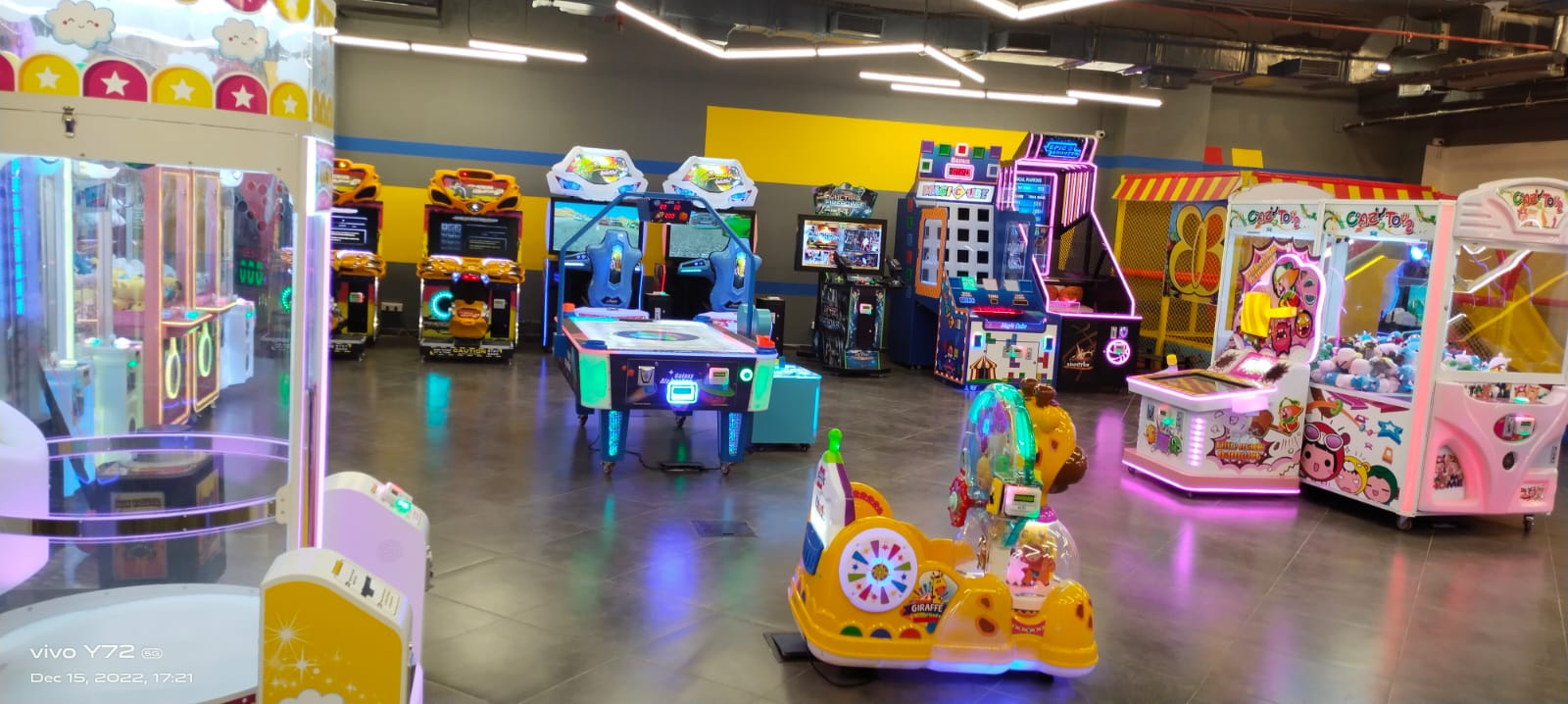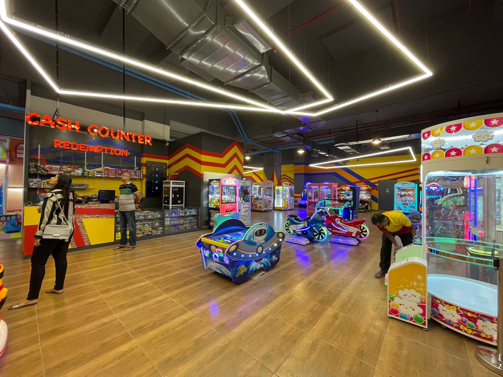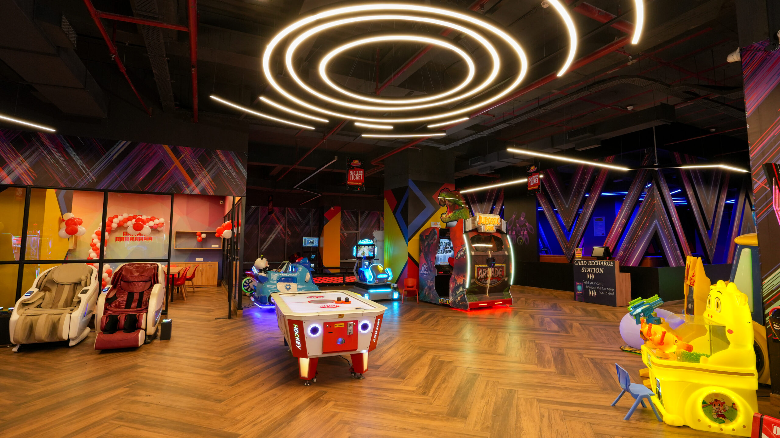 An energetic gaming zone infused with vivid LED lighting and contemporary design elements. The space seamlessly connects interactive play areas and glowing lounges, creating an immersive environment of color, rhythm, and joyful motion.