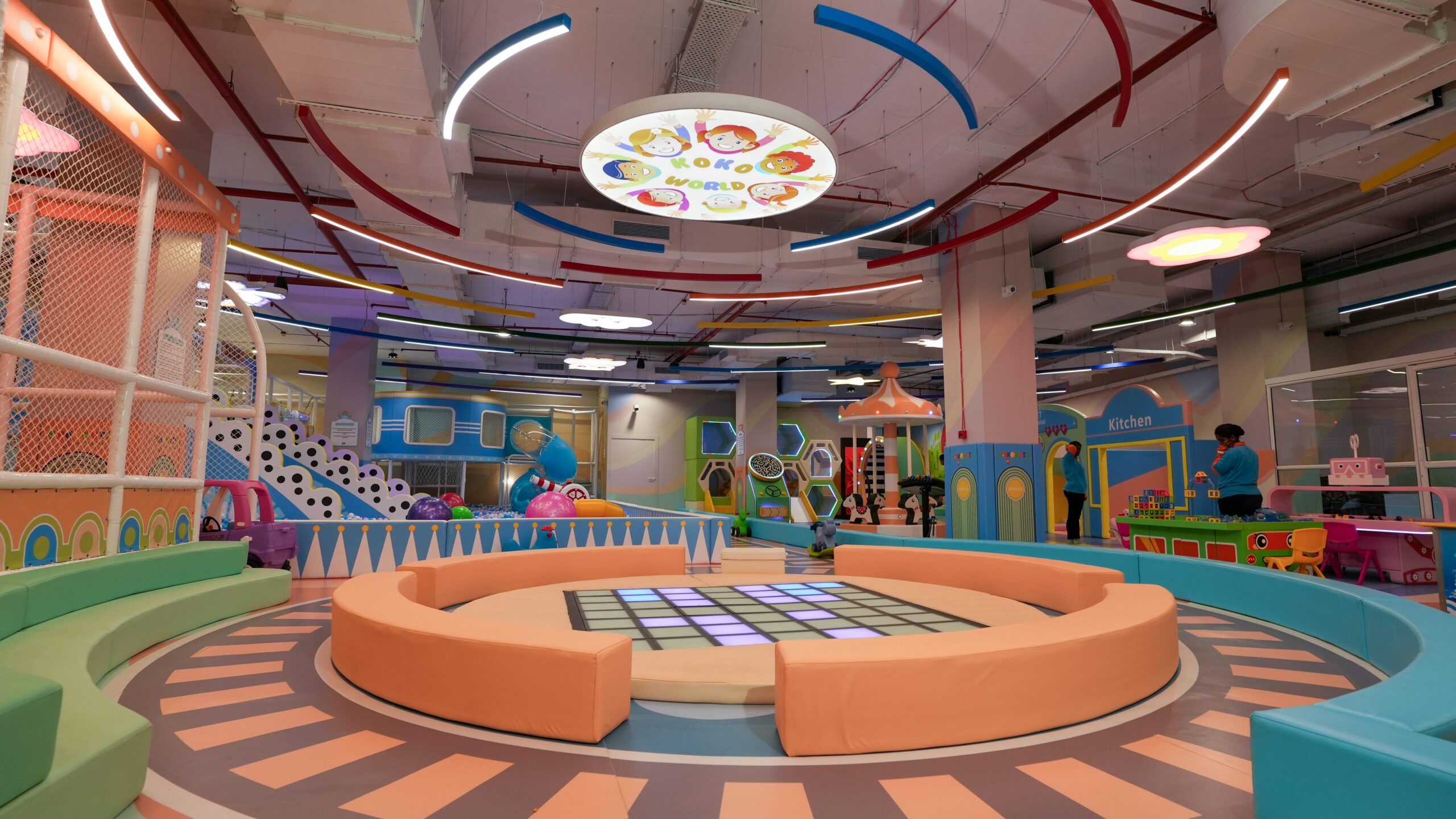 A vibrant indoor play and recreation zone designed to spark imagination and movement, featuring trampolines, slides, ball pits, and interactive installations—creating an immersive world of color, motion, and joy for children.