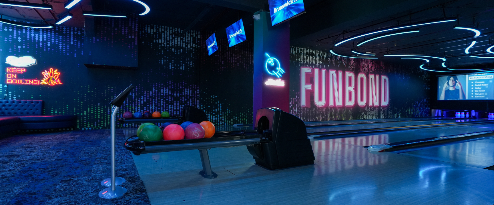A dynamic bowling lounge designed with immersive lighting and futuristic contours, blending sport and social leisure. The neon palette, digital graphics, and fluid ceiling forms create an energetic, cinematic atmosphere for play and connection.