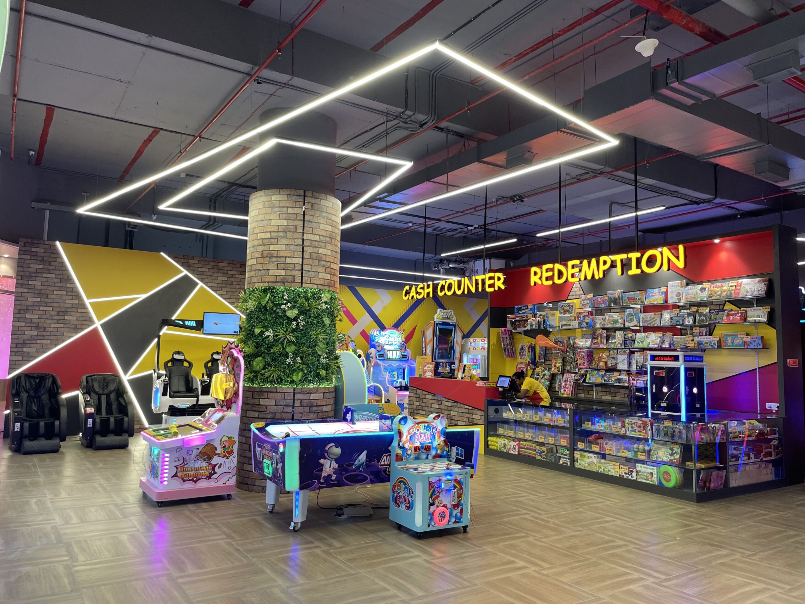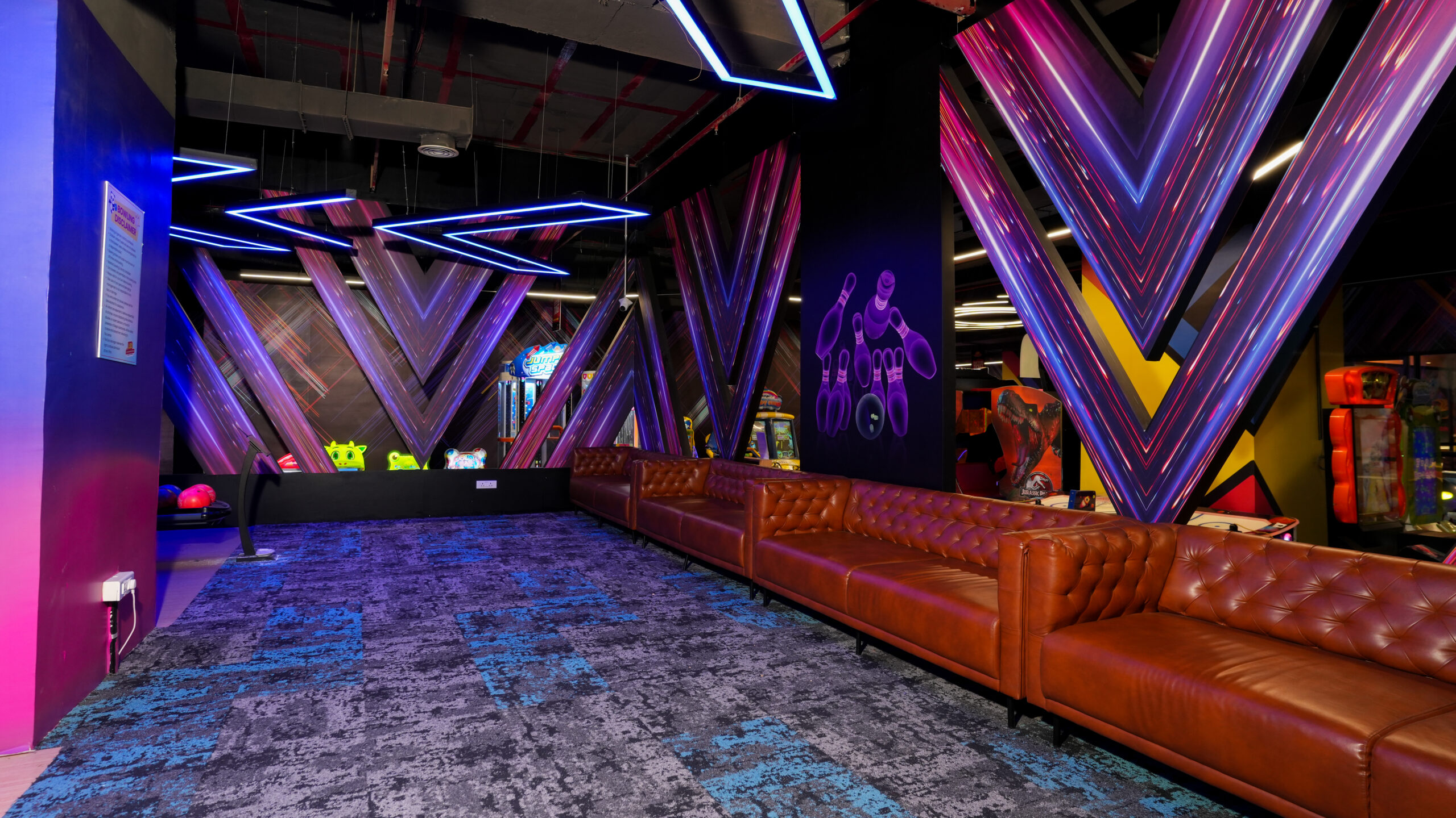 A dynamic gaming arena defined by vibrant lighting, angular forms, and immersive spatial transitions. The design combines LED highlights with interactive play experiences, creating an energetic environment that celebrates movement, excitement, and visual intensity.