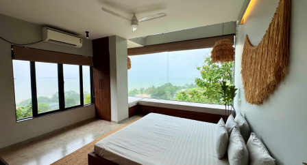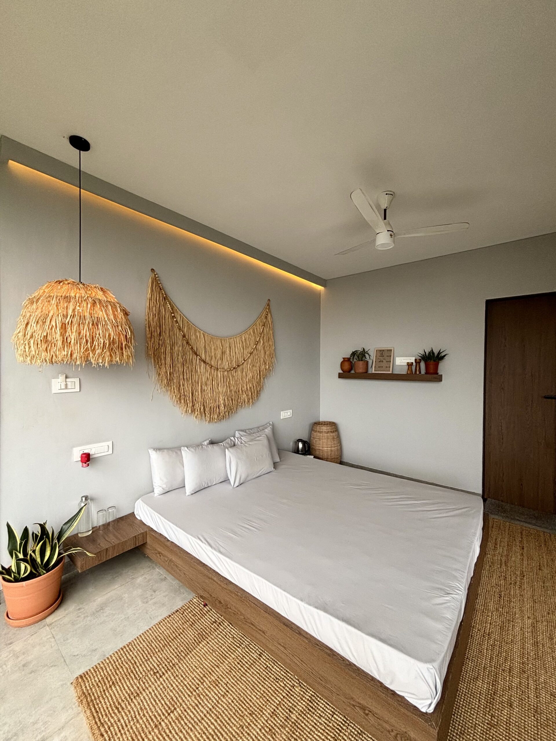 A bespoke luxury suite featuring a minimalist aesthetic, emphasizing clean lines, panoramic views, and natural light, with a strong commitment to earthy, woven textures.